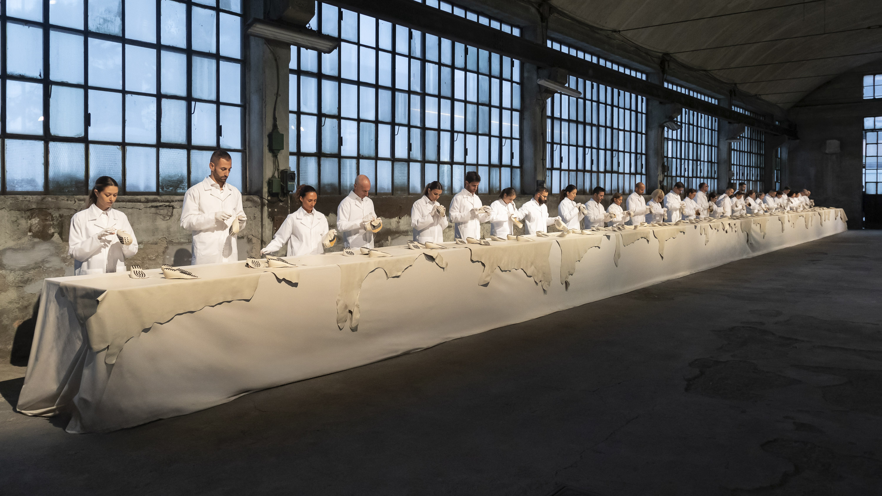 These values are expressed through the work of artist Lorenzo Quinn, renowned for his monumental sculptures of hands in plaster: two hands gripping crossed leather bands, symbolising craftsmanship excellence and Italian know-how, which have been created for the Tod's Women's Spring-Summer 2025 runway show.